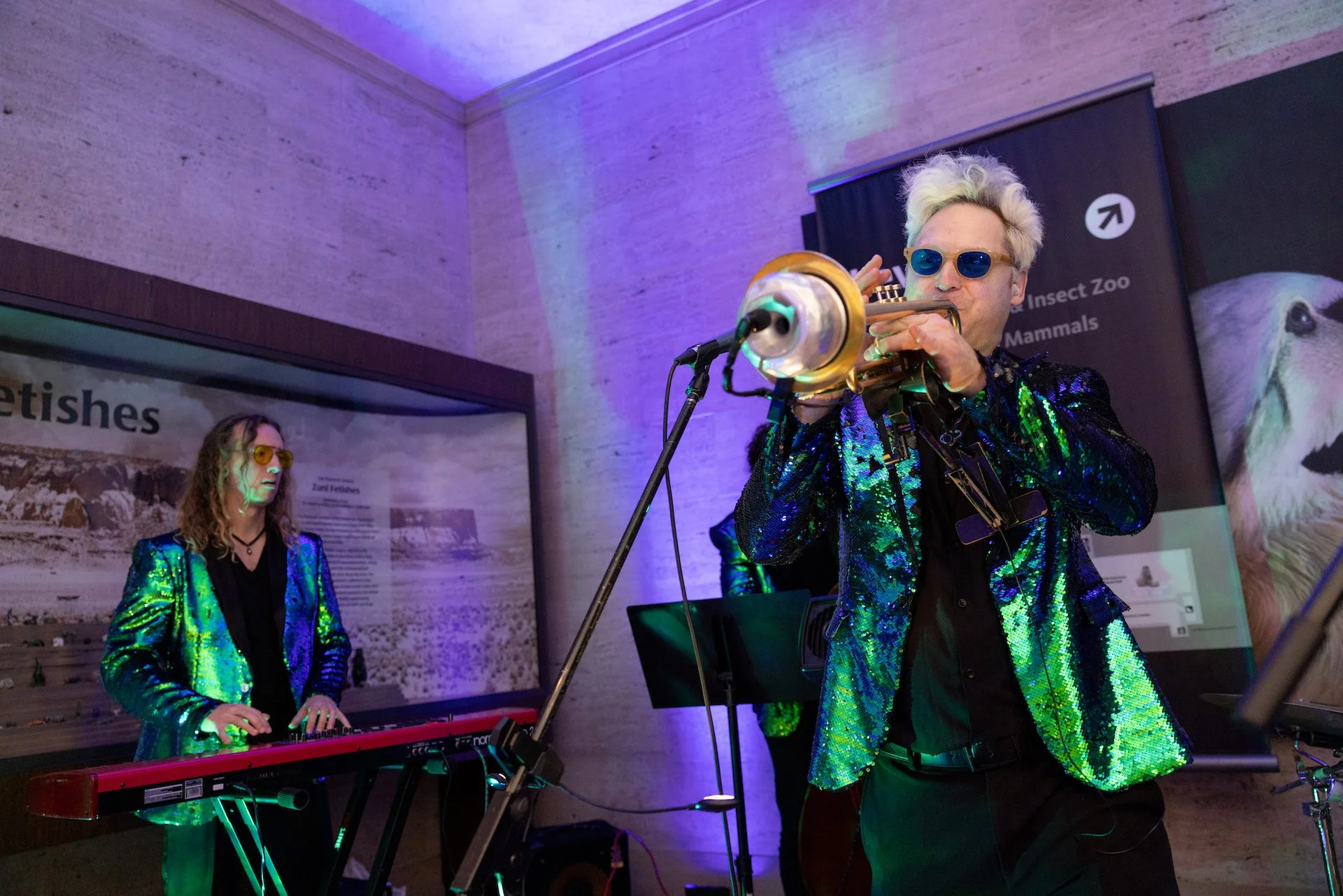 The event was completely immersive in nature, as guests started the evening wandering through the museum’s Nature Gardens to experience the sights and sounds of the earth 100 million years ago. To emerge from the flora and fauna, guests entered a golden tunnel where trumpets played upon each of their arrivals as they walked down a path lined with NHMLAC staff on both sides to cheer them on and welcome them to “Opening Night at the Museum in 1913.”